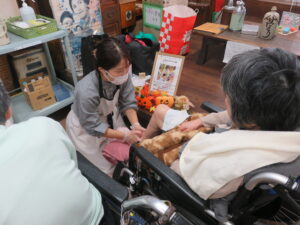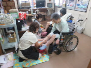 今月の美容レクはフットマッサージでした。ご利用者の中には座っている姿勢が長く、下半身にむくみがでやすい方がいますが、マッサージすることでリラックスや血行の促進などの効果を皆さん実感されていました。