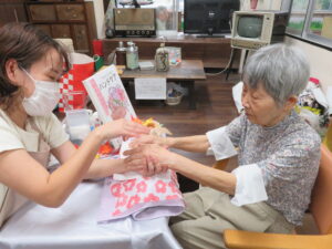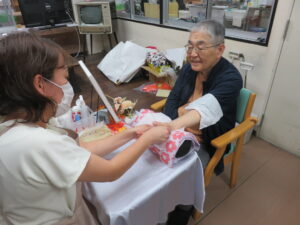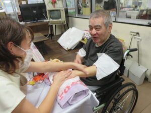 2025年10月20日 スタッフより ハンドマッサージ 10月15日にハンドマッサージを行いました!! 10月15日にハンドマッサージの美容レクを開催しました。 今回は男性率が高めでしたが、皆さん「気持ちいいな~」と満足されていました。 オイルを使って指先から丁寧にマッサージしてちょうどいい力加減でした。 施術中も会話を楽しまれて、心身共に癒しの時間となりました。