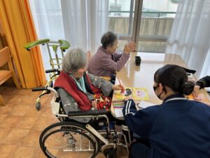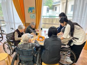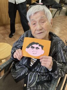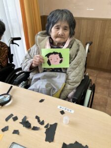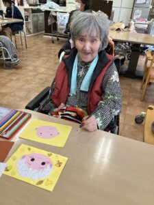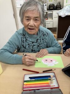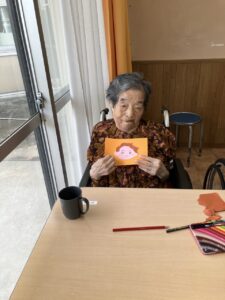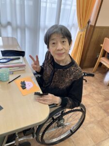 市内の中学生が授業の一環で施設に訪問してくださり、一緒に楽しく話などをしながら切り絵つくりを行いました。