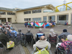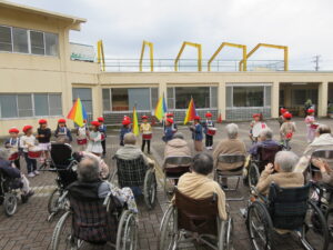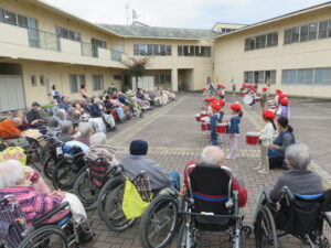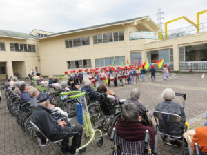 当日は中庭で先日終わった運動会で練習した演目をご利用者のために見せていただき、楽しひと時となりました。