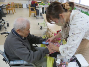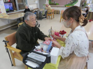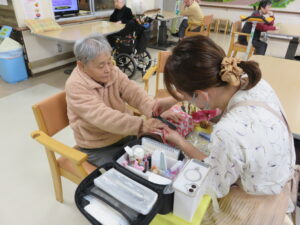 女性はもちろん男性の爪もケアしてもらいました。爪をきれいにしてもらいながら参加者はスタッフとの会話も楽しまれていました。