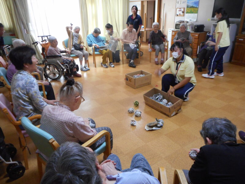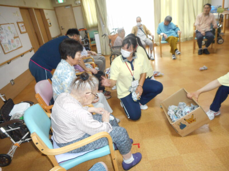 上手に遠くに投げ入れる入居者もおり「入ったぁ~!!」と喜ばれる方もいるなど、みんなが楽しめるレクリエーションになりました。