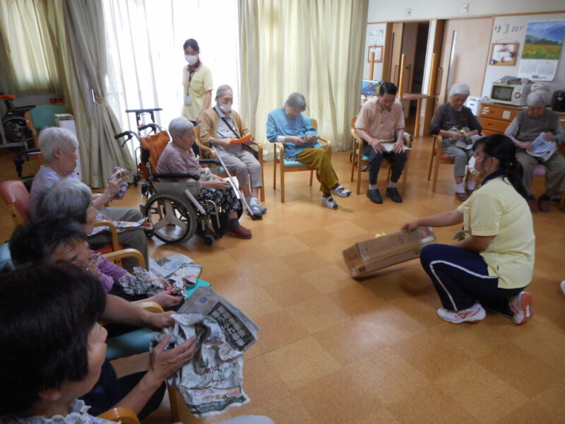 今回は新聞紙を丸めたものを、箱に狙って入れて頂くというゲームを企画してくれました。