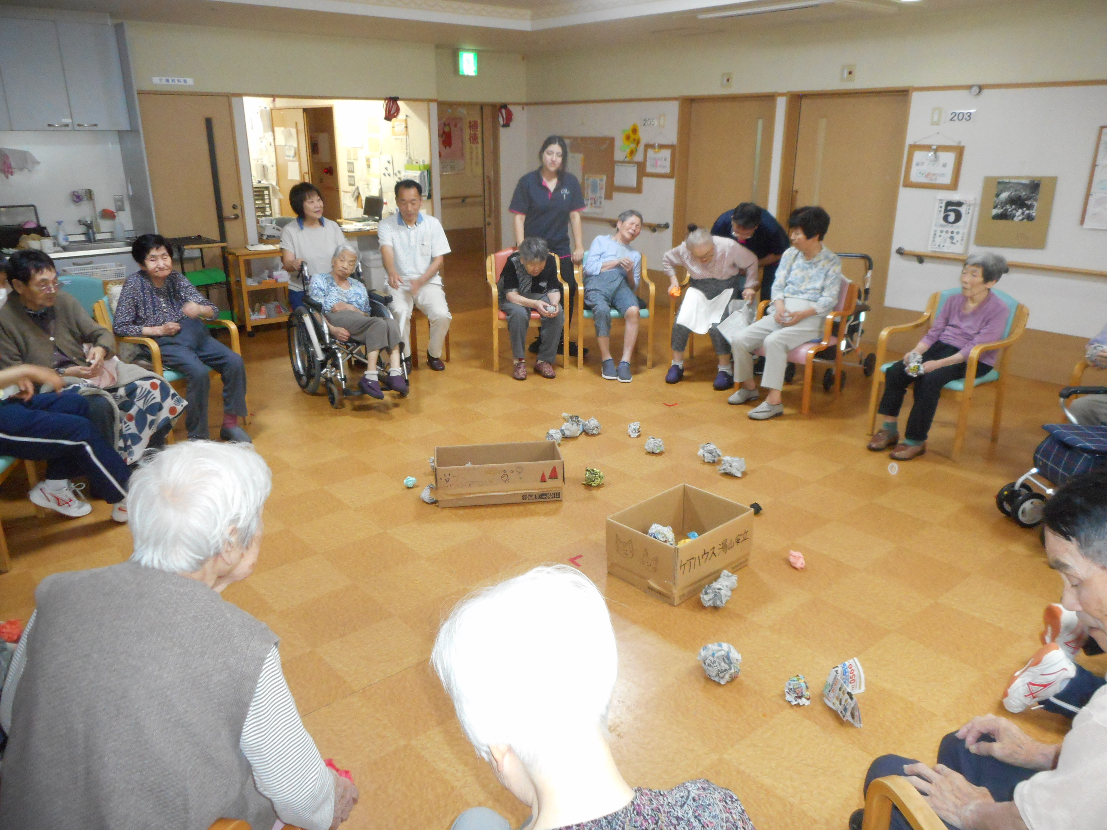 上手に遠くに投げ入れる入居者もおり「入ったぁ~!!」と喜ばれる方もいるなど、みんなが楽しめるレクリエーションになりました。