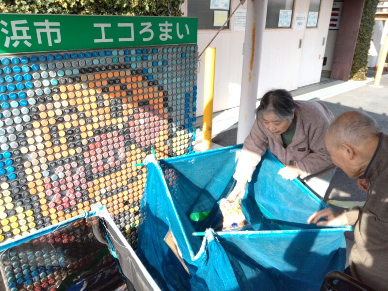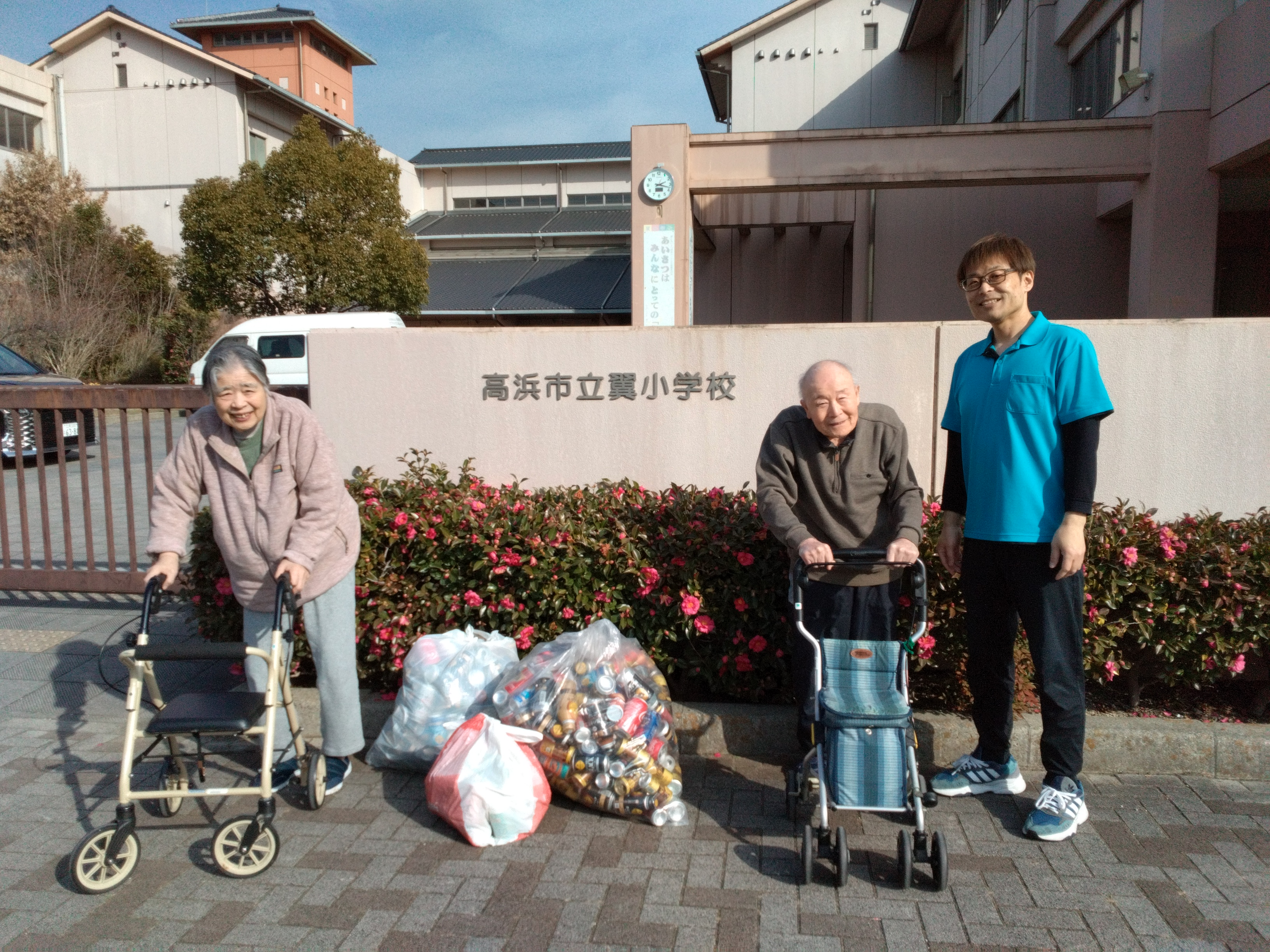 施設で集めていた空き缶とペットボトルキャップがたまってきたため入居者様と一緒に翼小学校と高浜エコハウスに行ってきました。